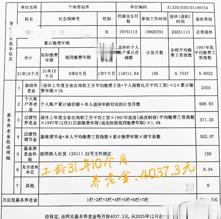 31年10个月工龄,平均缴费比例75.47%,2025年11月在浙江省50岁退休,养老金领了4037.3元,你羡慕吗?如果在你省份能领多少?