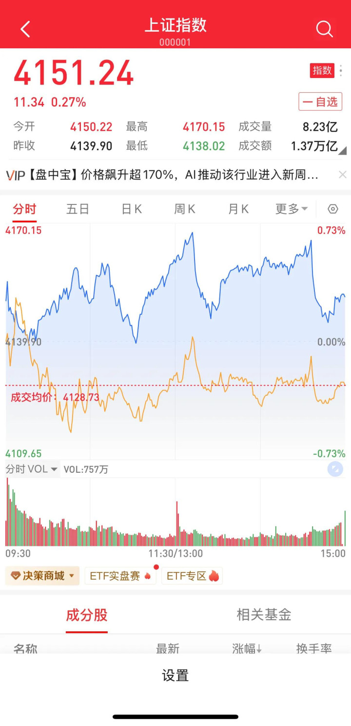 2026年1月28日,A股市场三大指数收盘涨跌不一。上证指数报4151.24点,上涨0.27%;深证成指报14342.89点,微涨0.09%;创业板指走势较弱,收报3323.56点,下跌0.57%。